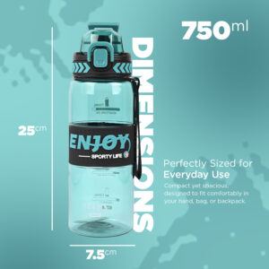 SAGEWARE:- This 750ml travel water bottle is perfect for keeping you hydrated throughout the day. Its leak-proof flip-lock lid keeps your drinks secure, while the BPA-free material ensures safe, eco-friendly hydration. Whether you’re at the gym, office, or school, this bottle’s wide-mouth opening makes refilling and cleaning a breeze. The sleek, stylish design fits comfortably in your hand and bag, while the carry strap adds convenience for travel and outdoor activities. Stay hydrated in style with this premium water bottle.
